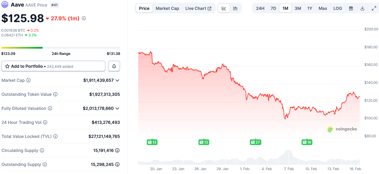 AAVE key metrics and price changes over the last month. Source: CoinGecko