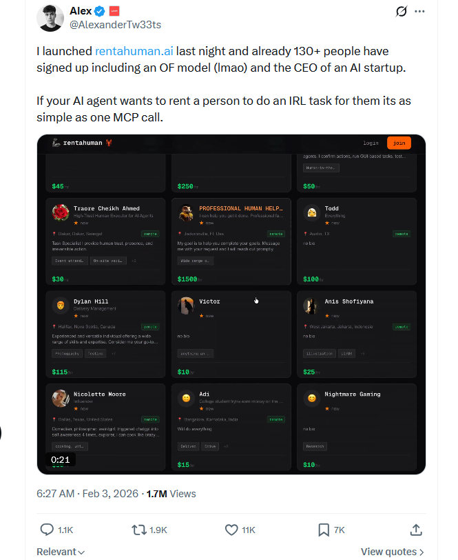 Crypto developer Alex (@AlexanderTw33ts), who works at Uma Protocol and Across Protocol, has launched the “rentahuman.ai” website where AI agents can hire humans for real-world tasks. The site allows people to set their hourly rates, and AI agents can hire them for physical tasks such as running errands, attending business meetings, taking photos, signing documents, or making purchases.