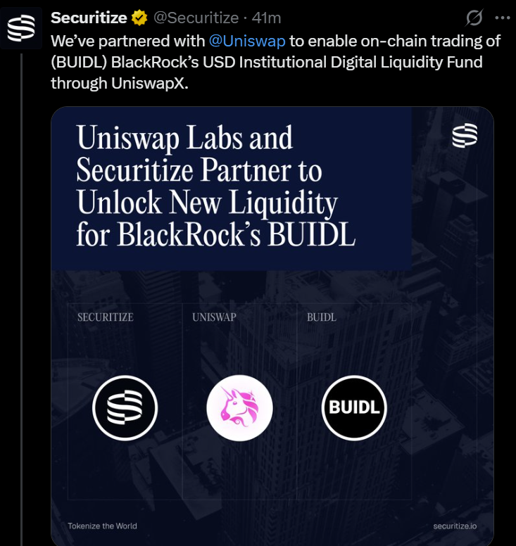 Asset management giant BlackRock is making its first official entry into DeFi by bringing its tokenized US Treasury fund BUIDL to the Uniswap decentralized exchange, representing a significant milestone in institutional adoption. With Wednesday's announcement, BUIDL is listed, enabling institutional investors to buy and sell the tokenized security. BlackRock will also purchase an unspecified amount of Uniswap's UNI governance token. The partnership is managed by Securitize, BUIDL's launch partner; it will initially be available to limited institutional investors and market makers.