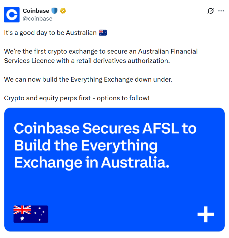 Coinbase, by obtaining a financial services license (AFSL) in Australia, begins offering cryptocurrency and stock futures while targeting an "everything exchange" that covers futures, options, stock trading, payments, and other traditional finance (TradFi) products. APAC regional director John O’Loghlen stated that the license will enable them to compete at the speed of traditional finance. The license binds Coinbase to the conduct, transparency, governance, and consumer protection standards that traditional finance providers are subject to; this is a significant milestone in Australia's efforts to create a special regulatory framework for digital assets.