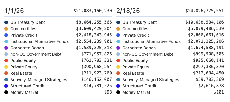 RWA market valuation by categories (Jan. 1 versus Feb. 18, 2026). Source: App.RWA.xyz
