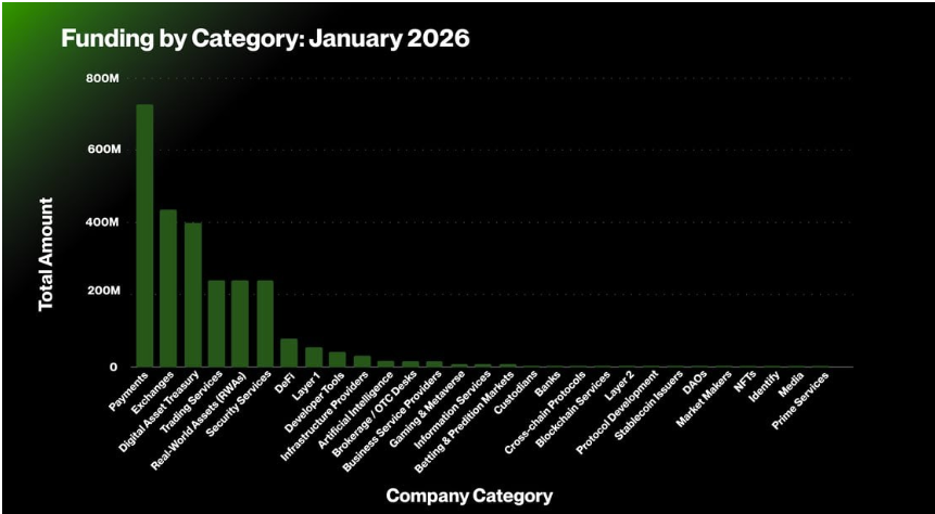 Payments, exchanges, digital asset treasuries and trading services saw the largest funding surge in January. Source: The TIE