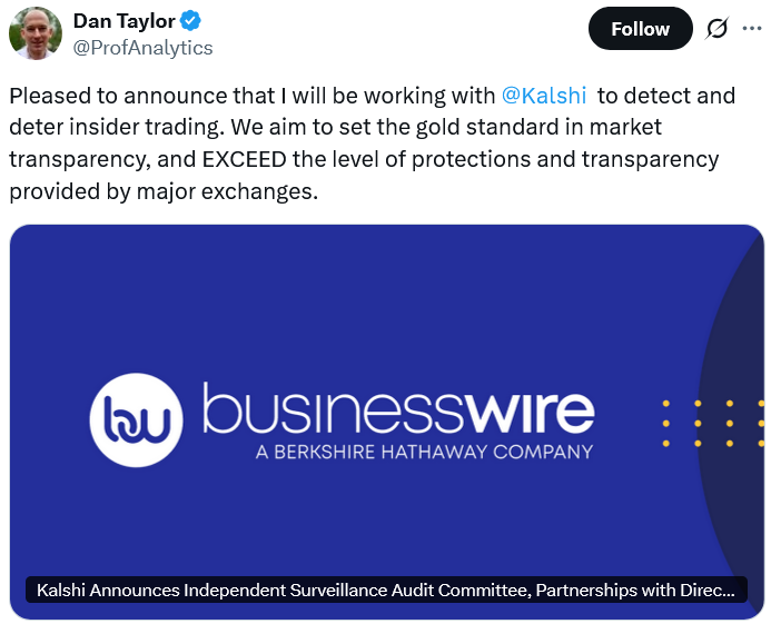 Kalshi announced that it has established an independent audit committee to prevent insider trading and market manipulation on its prediction market platform. Partnering with crypto trading surveillance platform Solidus Labs and Daniel Taylor, Director of the Wharton Forensic Analytics Lab, the company stated that the committee will provide quarterly reports to external advisors and publish statistics on suspicious activities. This step was taken three days before Super Bowl 60; more than 168 million dollars in bets were placed on the event on the platform.