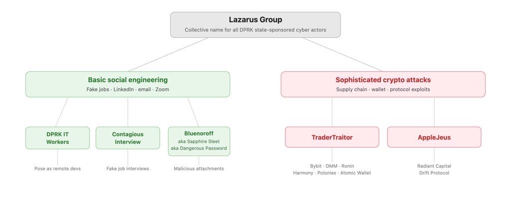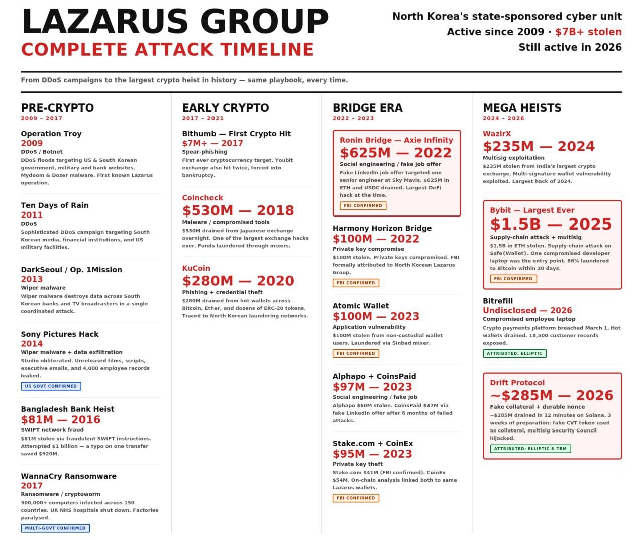 The group is responsible for the $625 million Ronin Bridge in 2022, the $235 million WazirX in 2024, and the $1.4 billion Bybit heist in 2025. Drift Protocol announced that the recent $280 million hack was carried out by a North Korea state-linked group and involved months of preparation. Preliminary investigation revealed that team members were personally approached and hired by North Korean intermediaries at conferences. Titan Exchange founder Tim Ahhl described a Lazarus agent candidate who was qualified in video interviews but refused an in-person meeting.