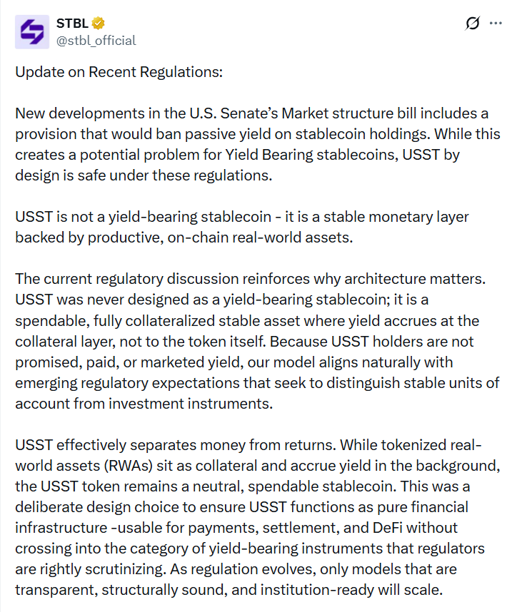 - Compliance: Compliant with US regulators; yield is kept separate from the stable unit.