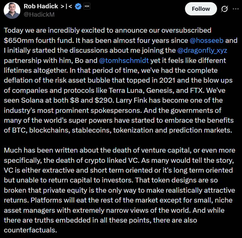 Dragonfly Capital closed its fourth fund at 650 million dollars and is focusing on blockchain-based financial products and tokenized RWAs. The firm states it is targeting payment systems, stablecoin networks, and lending markets. This fund will support RWA growth.