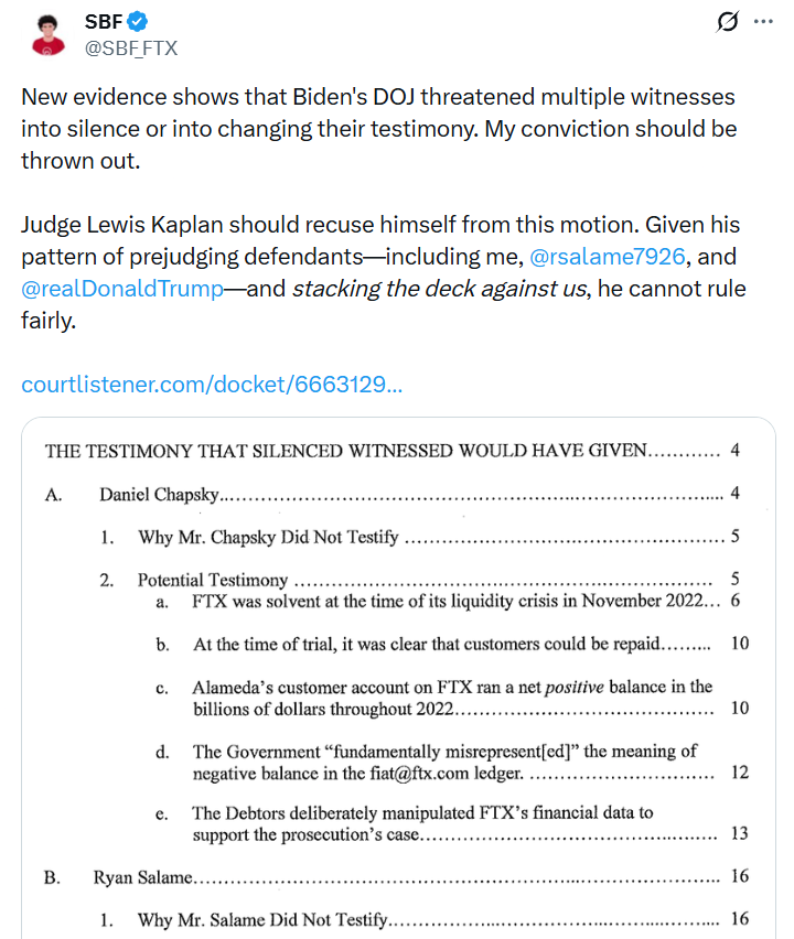 Sam “SBF” Bankman-Fried stated in a post from prison on his X account that he presented new evidence alleging that the U.S. Department of Justice (DOJ) silenced or altered statements of key witnesses during former President Joe Biden's term, and demanded the overturning of his conviction and a new trial. The filing submitted to the court on Thursday under Federal Rules of Criminal Procedure 33 includes a statement from former FTX employee Daniel Chapsky.