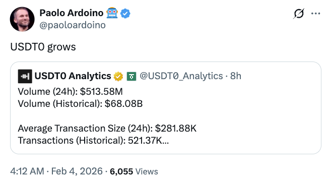 Tether CEO on Wednesday highlighted the growth of USDT-based stablecoin USDT0. Source: Paolo Ardoino