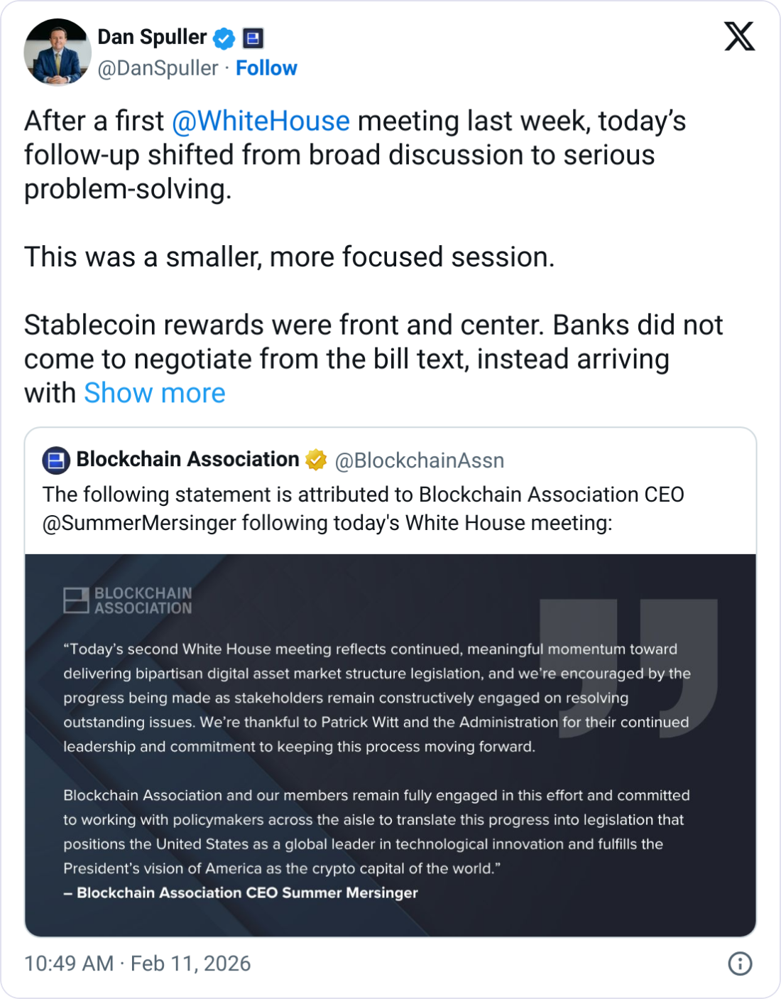 Coinbase withdrew its support last month due to provisions banning yield payments tied to stablecoins. Bankers argue that stablecoin yield payments on third-party platforms like exchanges put bank deposits at risk. In the second meeting within two weeks, Blockchain Association official Dan Spuller stated that stablecoin rewards were the focal point and that banks brought prohibition principles. Three major bank groups emphasized the need for more discussion. BitGo CEO Mike Belshe suggested not re-discussing the GENIUS Act and separating stablecoin yields from the market structure law.